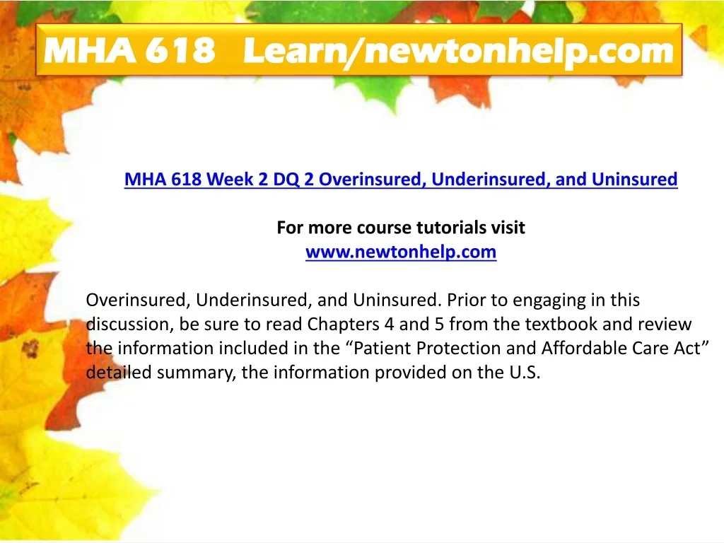 MHA 618 Learn/newtonhelp.com MHA 618 Week 2 DQ 2 Overinsured, Underinsured, and Uninsured For more course tutorials visit www.newtonhelp.com Overinsured, Underinsured, and Uninsured. Prior to engaging in this discussion, be sure to read Chapters 4 and 5 from the textbook and review the information included in the “Patient Protection and Affordable Care Act” detailed summary, the information provided on the U.S.