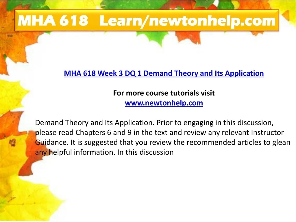 MHA 618 Learn/newtonhelp.com MHA 618 Week 3 DQ 1 Demand Theory and Its Application For more course tutorials visit www.newtonhelp.com Demand Theory and Its Application. Prior to engaging in this discussion, please read Chapters 6 and 9 in the text and review any relevant Instructor Guidance. It is suggested that you review the recommended articles to glean any helpful information. In this discussion