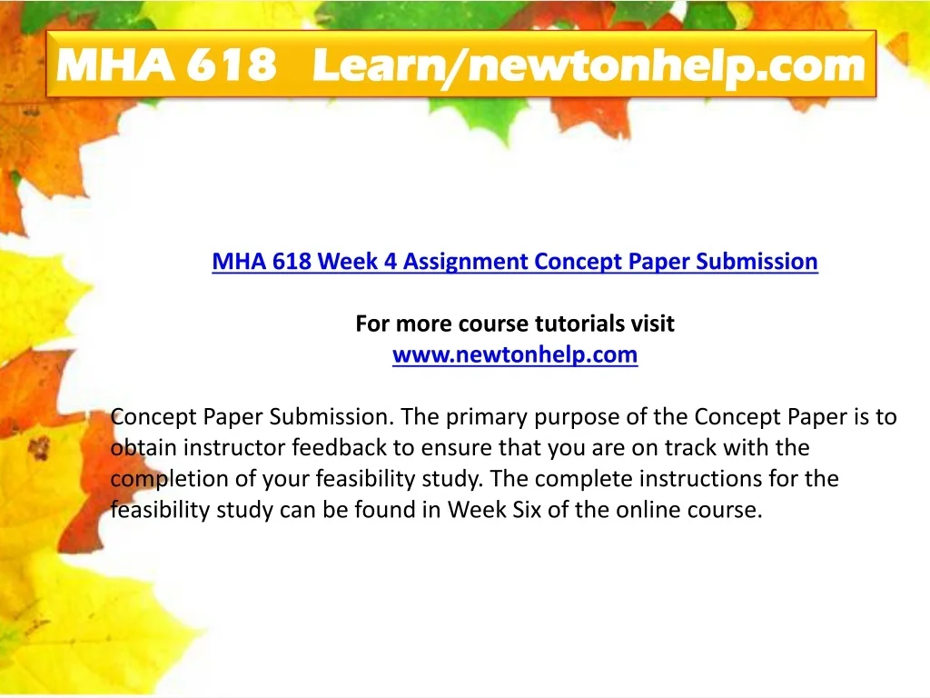 MHA 618 Learn/newtonhelp.com MHA 618 Week 4 Assignment Concept Paper Submission For more course tutorials visit www.newtonhelp.com Concept Paper Submission. The primary purpose of the Concept Paper is to obtain instructor feedback to ensure that you are on track with the completion of your feasibility study. The complete instructions for the feasibility study can be found in Week Six of the online course.
