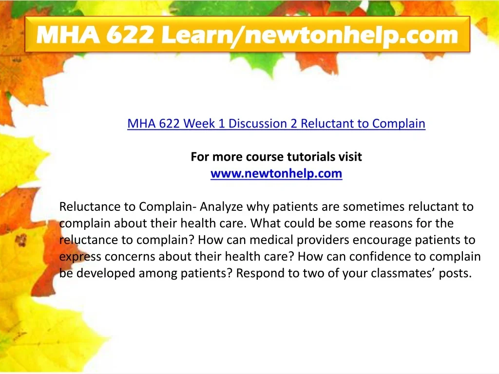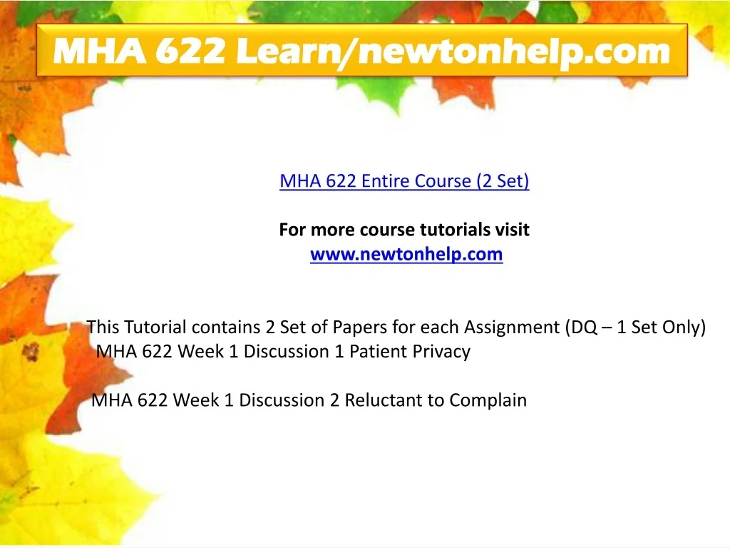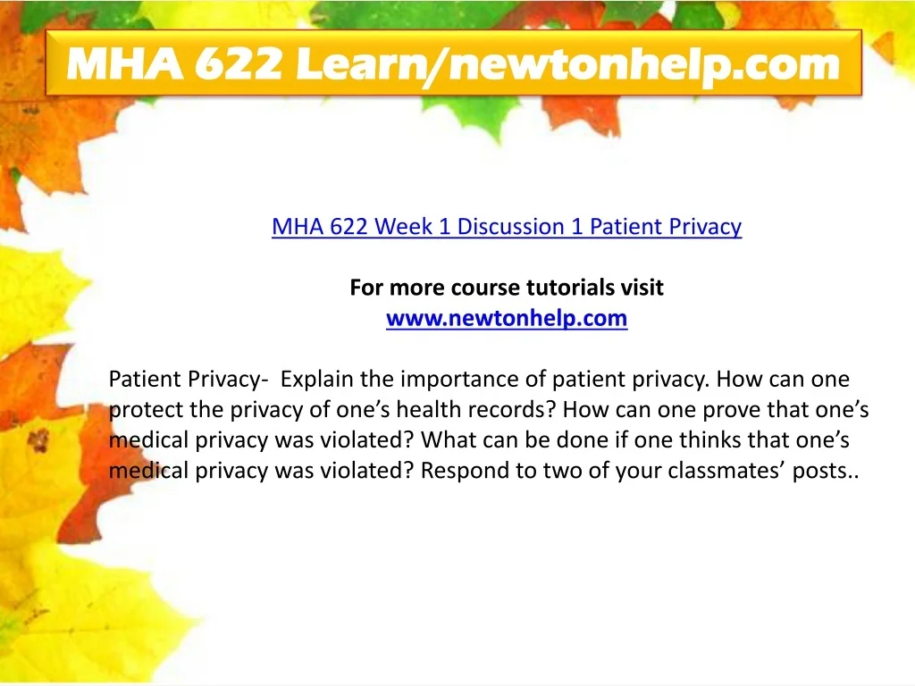 MHA 622 Learn/newtonhelp.com MHA 622 Entire Course (2 Set) For more course tutorials visit www.newtonhelp.com This Tutorial contains 2 Set of Papers for each Assignment (DQ – 1 Set Only) MHA 622 Week 1 Discussion 1 Patient Privacy MHA 622 Week 1 Discussion 2 Reluctant to Complain