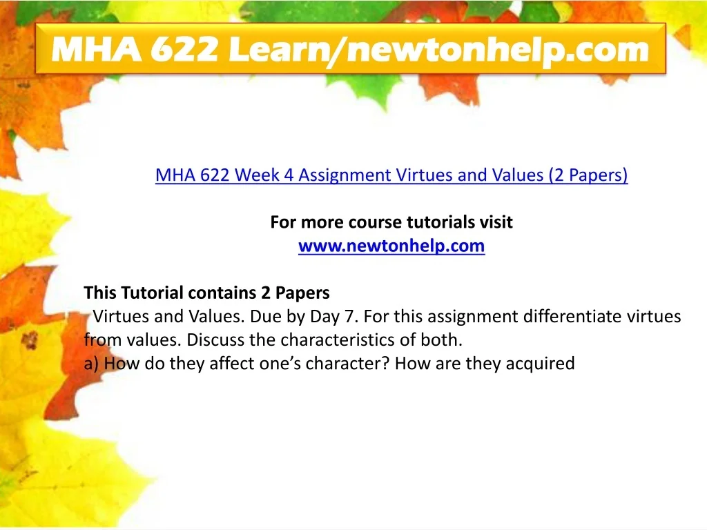 MHA 622 Learn/newtonhelp.com MHA 622 Week 4 Assignment Virtues and Values (2 Papers) For more course tutorials visit www.newtonhelp.com This Tutorial contains 2 Papers Virtues and Values. Due by Day 7. For this assignment differentiate virtues from values. Discuss the characteristics of both. a) How do they affect one’s character? How are they acquired