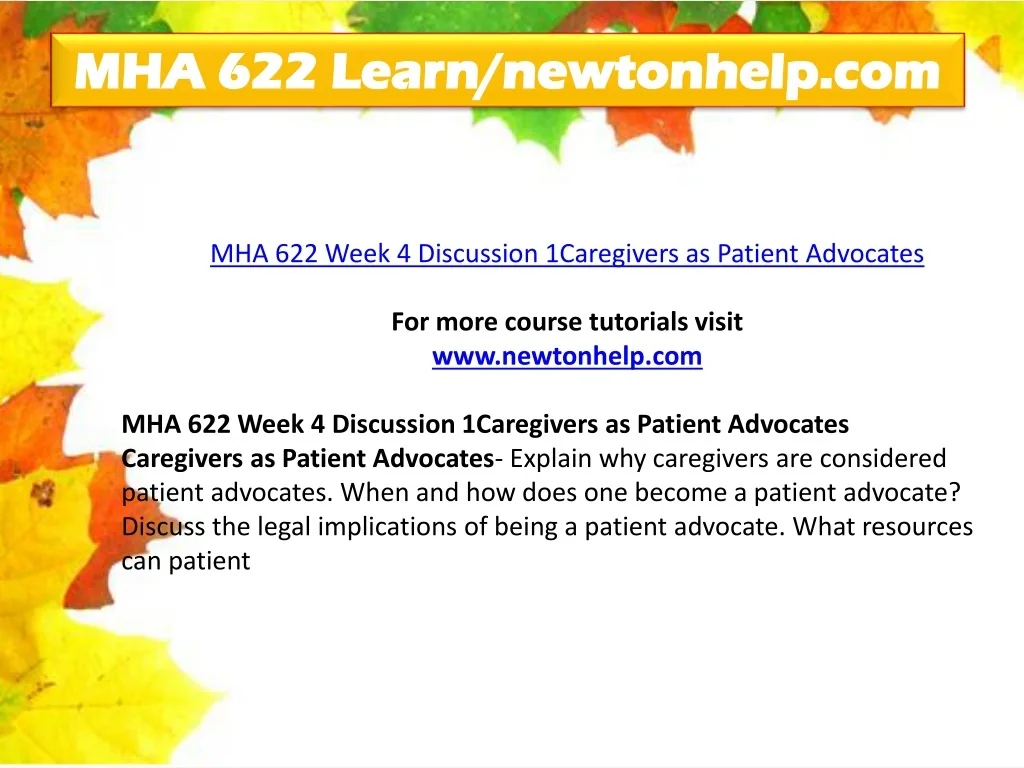 MHA 622 Learn/newtonhelp.com MHA 622 Week 4 Discussion 1Caregivers as Patient Advocates For more course tutorials visit www.newtonhelp.com MHA 622 Week 4 Discussion 1Caregivers as Patient Advocates Caregivers as Patient Advocates- Explain why caregivers are considered patient advocates. When and how does one become a patient advocate? Discuss the legal implications of being a patient advocate. What resources can patient