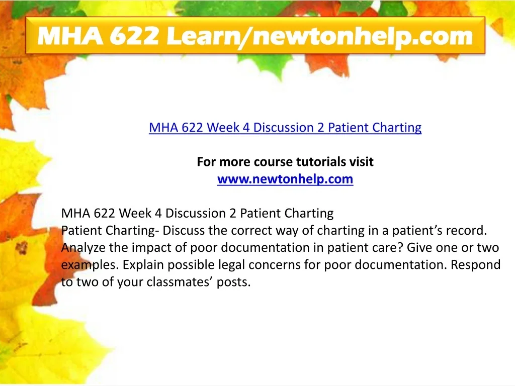 MHA 622 Learn/newtonhelp.com MHA 622 Week 4 Discussion 2 Patient Charting For more course tutorials visit www.newtonhelp.com MHA 622 Week 4 Discussion 2 Patient Charting Patient Charting- Discuss the correct way of charting in a patient’s record. Analyze the impact of poor documentation in patient care? Give one or two examples. Explain possible legal concerns for poor documentation. Respond to two of your classmates’ posts.