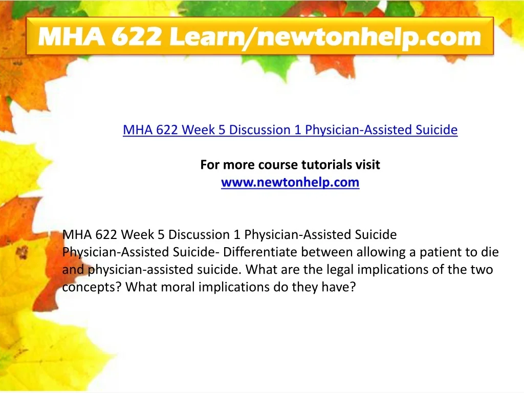 MHA 622 Learn/newtonhelp.com MHA 622 Week 5 Discussion 1 Physician-Assisted Suicide For more course tutorials visit www.newtonhelp.com MHA 622 Week 5 Discussion 1 Physician-Assisted Suicide Physician-Assisted Suicide- Differentiate between allowing a patient to die and physician-assisted suicide. What are the legal implications of the two concepts? What moral implications do they have?
