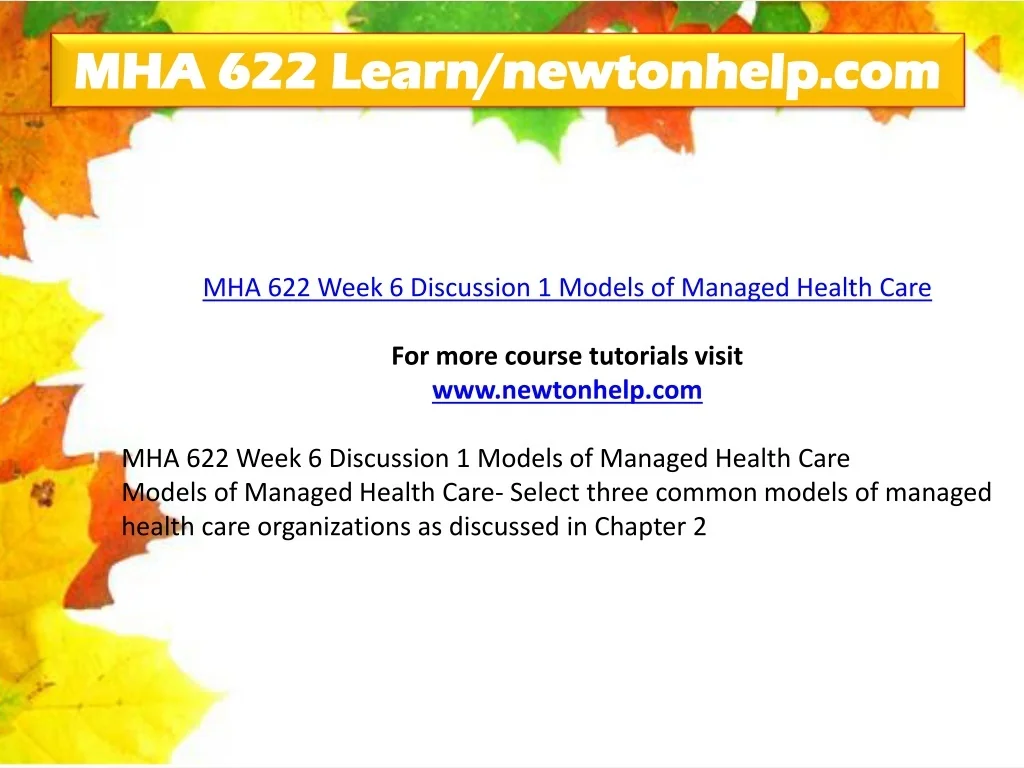 MHA 622 Learn/newtonhelp.com MHA 622 Week 6 Discussion 1 Models of Managed Health Care For more course tutorials visit www.newtonhelp.com MHA 622 Week 6 Discussion 1 Models of Managed Health Care Models of Managed Health Care- Select three common models of managed health care organizations as discussed in Chapter 2