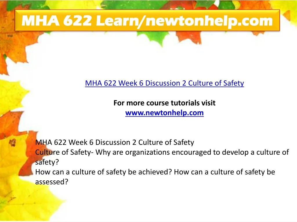MHA 622 Learn/newtonhelp.com MHA 622 Week 6 Discussion 2 Culture of Safety For more course tutorials visit www.newtonhelp.com MHA 622 Week 6 Discussion 2 Culture of Safety Culture of Safety- Why are organizations encouraged to develop a culture of safety? How can a culture of safety be achieved? How can a culture of safety be assessed?