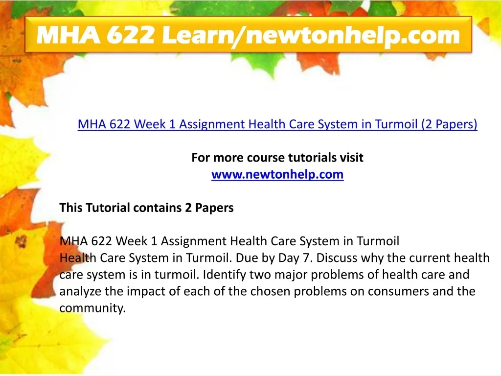 MHA 622 Learn/newtonhelp.com MHA 622 Week 1 Assignment Health Care System in Turmoil (2 Papers) For more course tutorials visit www.newtonhelp.com This Tutorial contains 2 Papers MHA 622 Week 1 Assignment Health Care System in Turmoil Health Care System in Turmoil. Due by Day 7. Discuss why the current health care system is in turmoil. Identify two major problems of health care and analyze the impact of each of the chosen problems on consumers and the community.