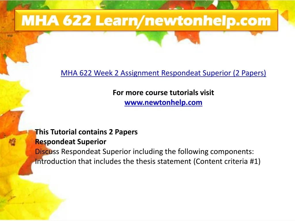 MHA 622 Learn/newtonhelp.com • MHA 622 Week 2 Assignment Respondeat Superior (2 Papers) • For more course tutorials visit • www.newtonhelp.com • This Tutorial contains 2 Papers • Respondeat Superior • Discuss Respondeat Superior including the following components: • Introduction that includes the thesis statement (Content criteria #1)