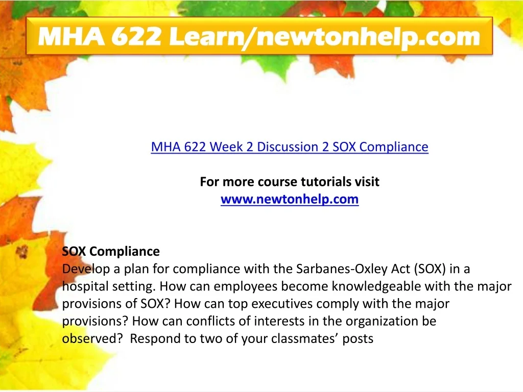 MHA 622 Learn/newtonhelp.com MHA 622 Week 2 Discussion 2 SOX Compliance For more course tutorials visit www.newtonhelp.com SOX Compliance Develop a plan for compliance with the Sarbanes-Oxley Act (SOX) in a hospital setting. How can employees become knowledgeable with the major provisions of SOX? How can top executives comply with the major provisions? How can conflicts of interests in the organization be observed? Respond to two of your classmates’ posts