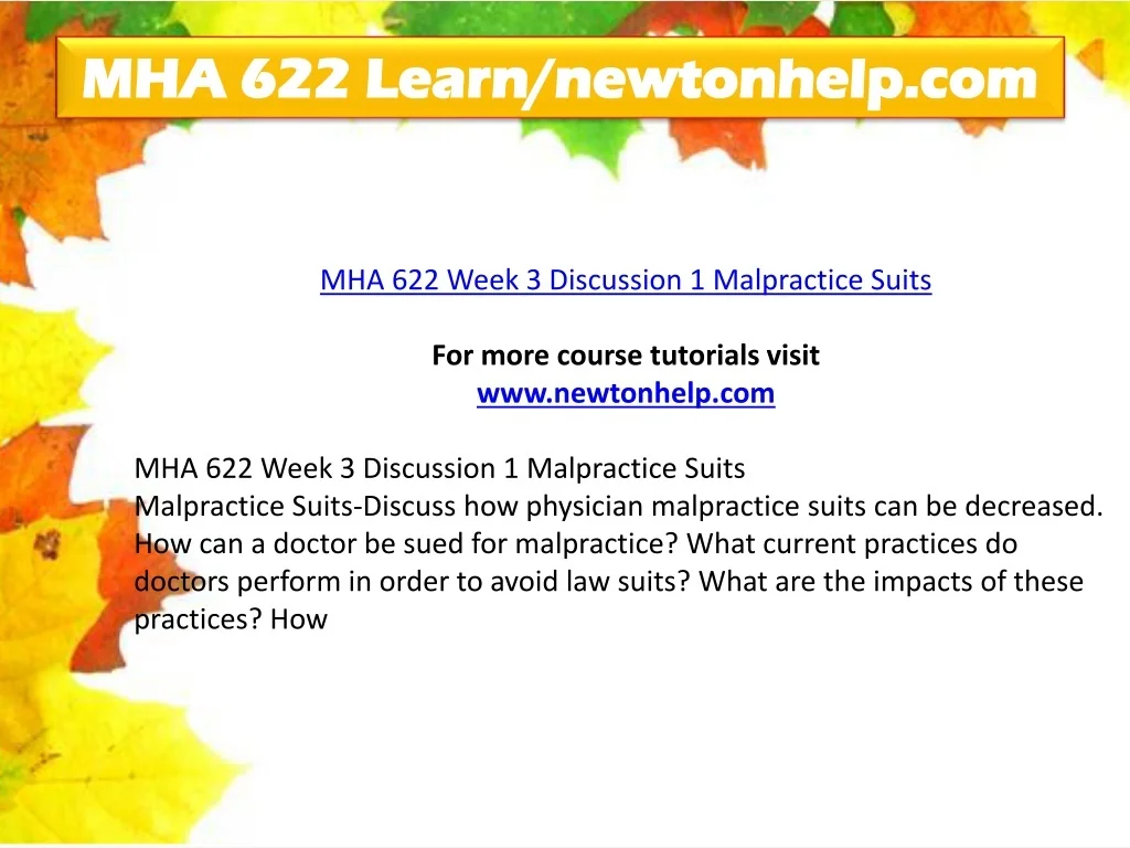 MHA 622 Learn/newtonhelp.com MHA 622 Week 3 Discussion 1 Malpractice Suits For more course tutorials visit www.newtonhelp.com MHA 622 Week 3 Discussion 1 Malpractice Suits Malpractice Suits-Discuss how physician malpractice suits can be decreased. How can a doctor be sued for malpractice? What current practices do doctors perform in order to avoid law suits? What are the impacts of these practices? How