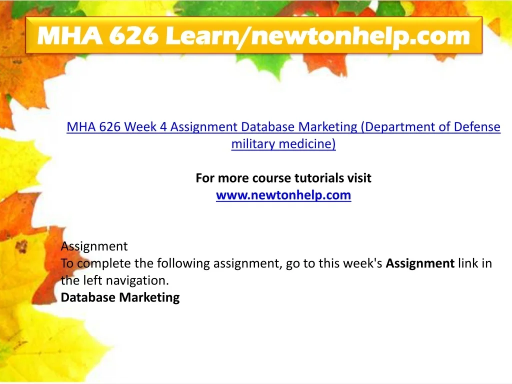 MHA 626 Learn/newtonhelp.com MHA 626 Week 4 Assignment Database Marketing (Department of Defense military medicine) For more course tutorials visit www.newtonhelp.com AssignmentTo complete the following assignment, go to this week's Assignment link in the left navigation. Database Marketing