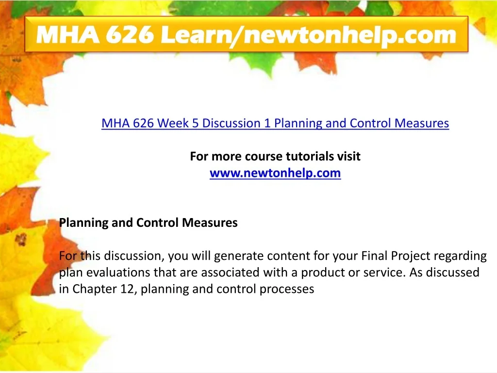 MHA 626 Learn/newtonhelp.com MHA 626 Week 5 Discussion 1 Planning and Control Measures For more course tutorials visit www.newtonhelp.com Planning and Control Measures For this discussion, you will generate content for your Final Project regarding plan evaluations that are associated with a product or service. As discussed in Chapter 12, planning and control processes