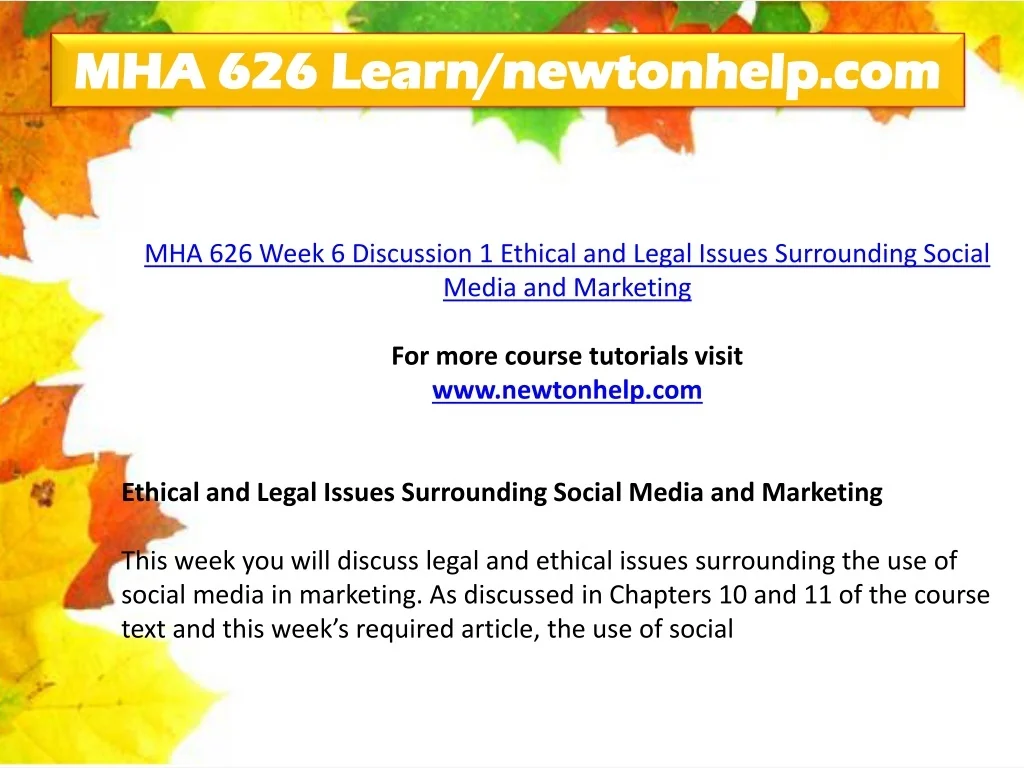 MHA 626 Learn/newtonhelp.com MHA 626 Week 6 Discussion 1 Ethical and Legal Issues Surrounding Social Media and Marketing For more course tutorials visit www.newtonhelp.com Ethical and Legal Issues Surrounding Social Media and Marketing This week you will discuss legal and ethical issues surrounding the use of social media in marketing. As discussed in Chapters 10 and 11 of the course text and this week’s required article, the use of social