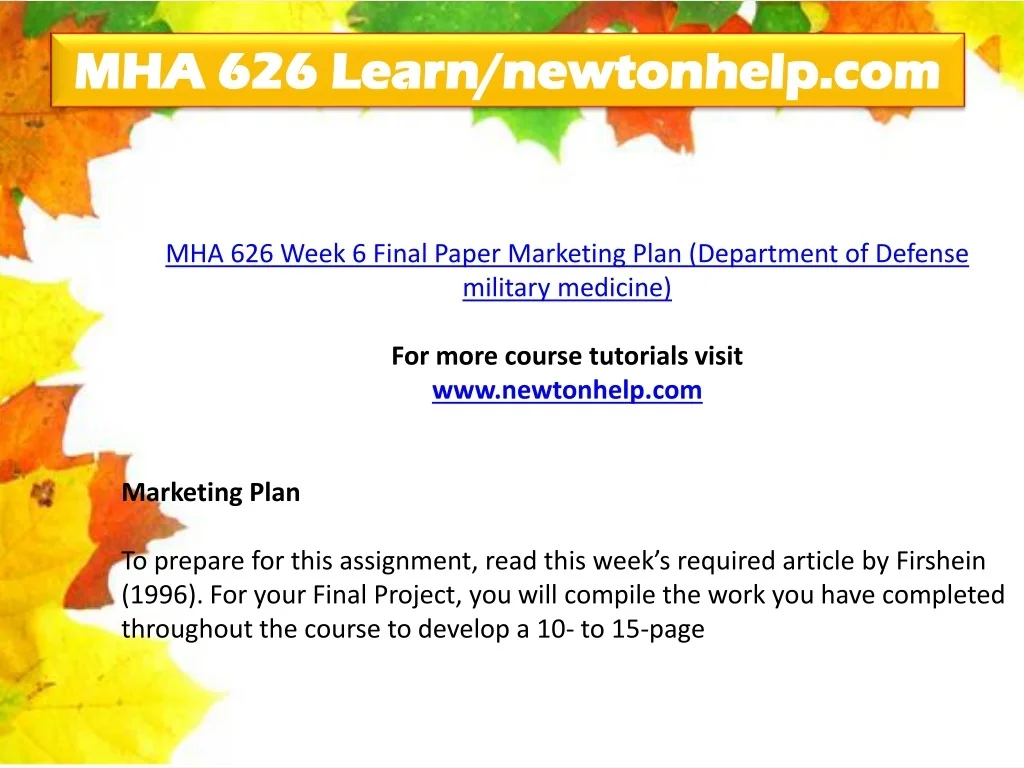 MHA 626 Learn/newtonhelp.com MHA 626 Week 6 Final Paper Marketing Plan (Department of Defense military medicine) For more course tutorials visit www.newtonhelp.com Marketing PlanTo prepare for this assignment, read this week’s required article by Firshein (1996). For your Final Project, you will compile the work you have completed throughout the course to develop a 10- to 15-page