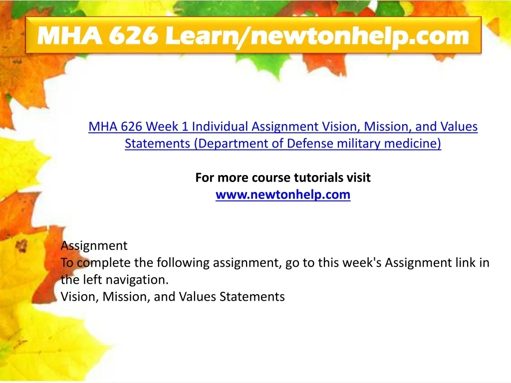 MHA 626 Learn/newtonhelp.com MHA 626 Week 1 Individual Assignment Vision, Mission, and Values Statements (Department of Defense military medicine) For more course tutorials visit www.newtonhelp.com Assignment To complete the following assignment, go to this week's Assignment link in the left navigation. Vision, Mission, and Values Statements