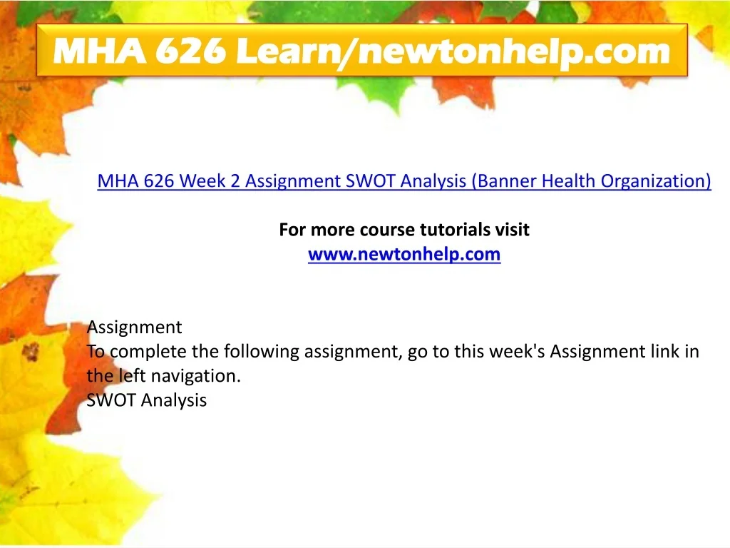 MHA 626 Learn/newtonhelp.com MHA 626 Week 2 Assignment SWOT Analysis (Banner Health Organization) For more course tutorials visit www.newtonhelp.com Assignment To complete the following assignment, go to this week's Assignment link in the left navigation. SWOT Analysis