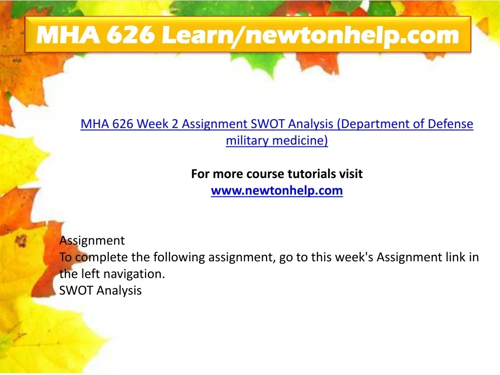 MHA 626 Learn/newtonhelp.com MHA 626 Week 2 Assignment SWOT Analysis (Department of Defense military medicine) For more course tutorials visit www.newtonhelp.com Assignment To complete the following assignment, go to this week's Assignment link in the left navigation. SWOT Analysis