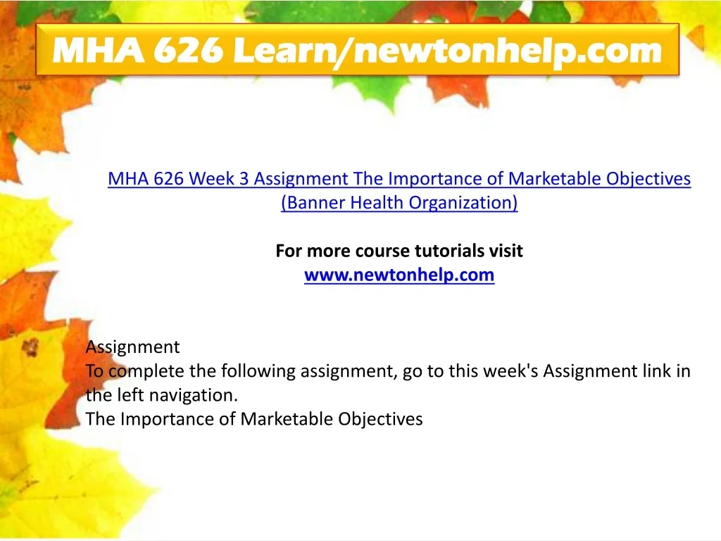 MHA 626 Learn/newtonhelp.com MHA 626 Week 3 Assignment The Importance of Marketable Objectives (Banner Health Organization) For more course tutorials visit www.newtonhelp.com Assignment To complete the following assignment, go to this week's Assignment link in the left navigation. The Importance of Marketable Objectives