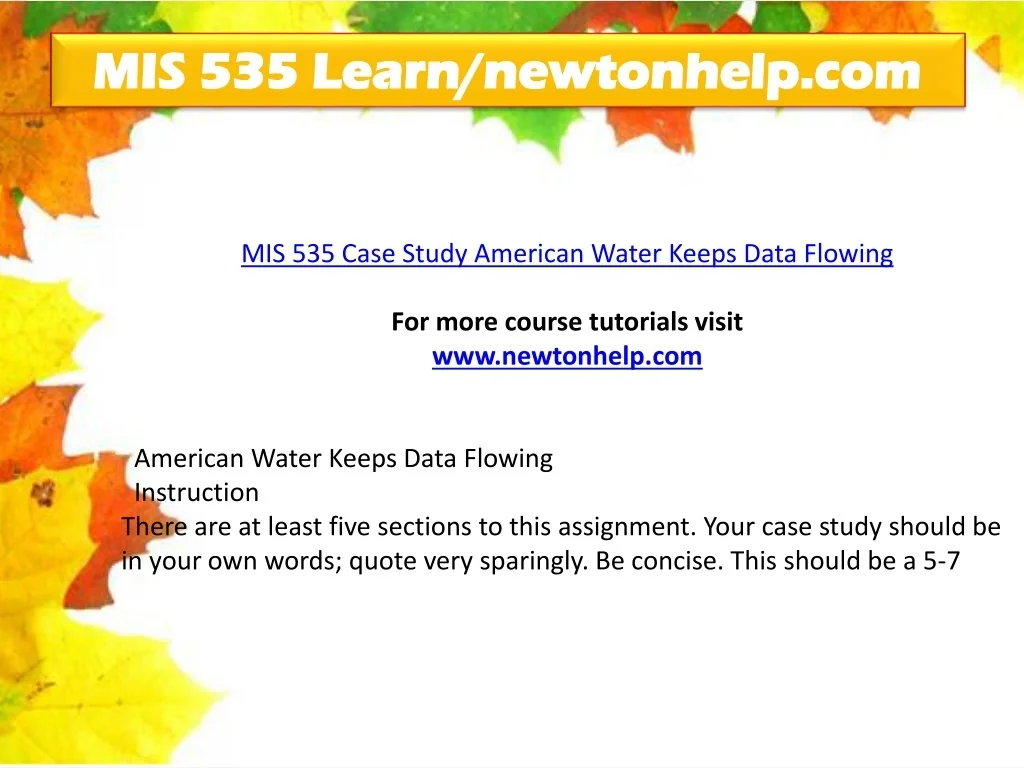 MIS 535 Learn/newtonhelp.com MIS 535 Case Study American Water Keeps Data Flowing For more course tutorials visit www.newtonhelp.com American Water Keeps Data Flowing Instruction There are at least five sections to this assignment. Your case study should be in your own words; quote very sparingly. Be concise. This should be a 5-7