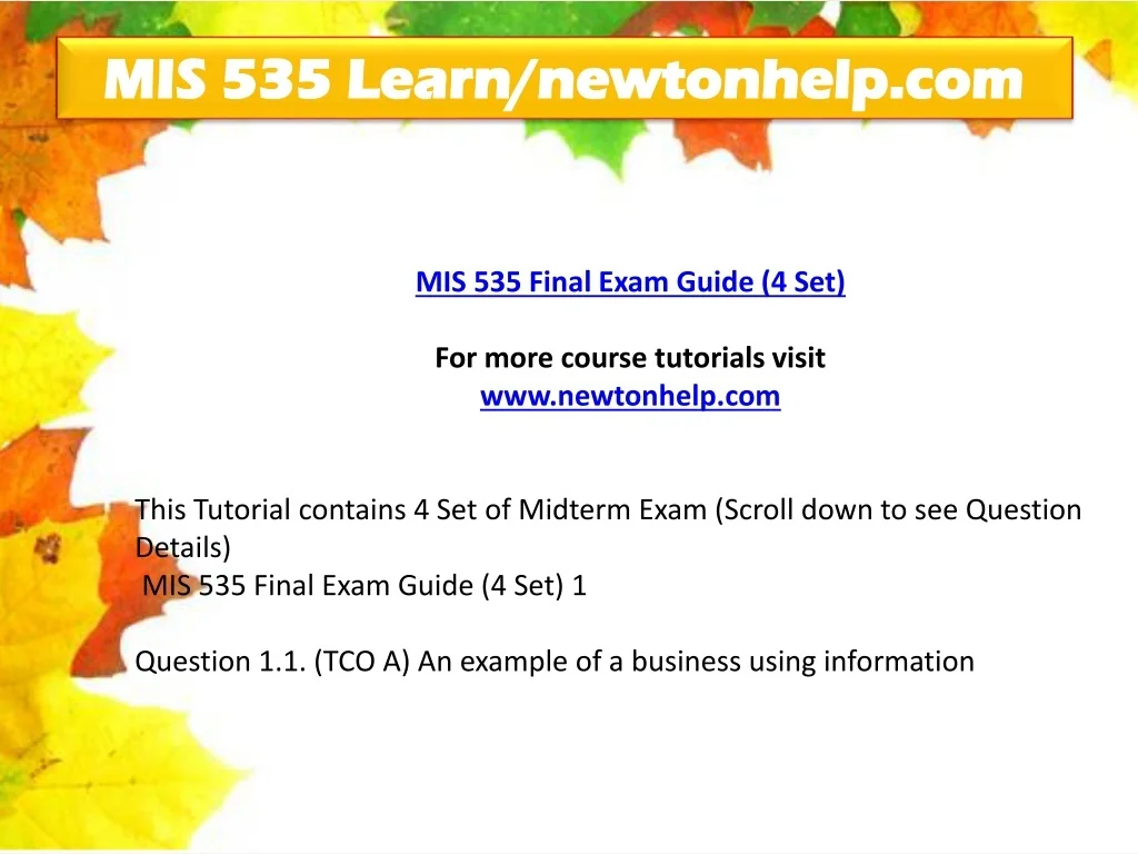MIS 535 Learn/newtonhelp.com MIS 535 Final Exam Guide (4 Set) For more course tutorials visit www.newtonhelp.com This Tutorial contains 4 Set of Midterm Exam (Scroll down to see Question Details) MIS 535 Final Exam Guide (4 Set) 1 Question 1.1. (TCO A) An example of a business using information