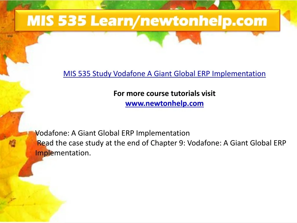MIS 535 Learn/newtonhelp.com MIS 535 Study Vodafone A Giant Global ERP Implementation For more course tutorials visit www.newtonhelp.com Vodafone: A Giant Global ERP Implementation Read the case study at the end of Chapter 9: Vodafone: A Giant Global ERP Implementation.