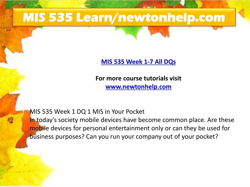 MIS 535 Learn/newtonhelp.com MIS 535 Week 1-7 All DQs For more course tutorials visit www.newtonhelp.com MIS 535 Week 1 DQ 1 MIS in Your Pocket In today's society mobile devices have become common place. Are these mobile devices for personal entertainment only or can they be used for business purposes? Can you run your company out of your pocket?