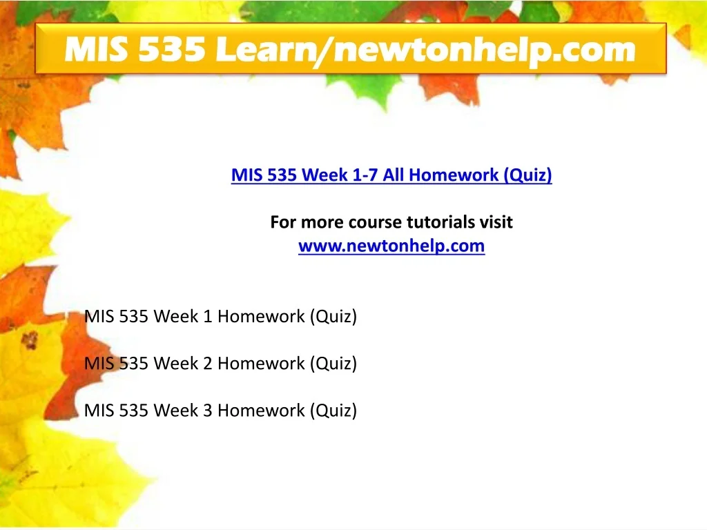 MIS 535 Learn/newtonhelp.com MIS 535 Week 1-7 All Homework (Quiz) For more course tutorials visit www.newtonhelp.com MIS 535 Week 1 Homework (Quiz) MIS 535 Week 2 Homework (Quiz) MIS 535 Week 3 Homework (Quiz)