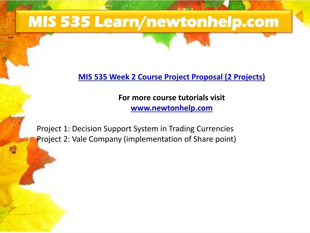 MIS 535 Learn/newtonhelp.com MIS 535 Week 2 Course Project Proposal (2 Projects) For more course tutorials visit www.newtonhelp.com Project 1: Decision Support System in Trading Currencies Project 2: Vale Company (implementation of Share point)