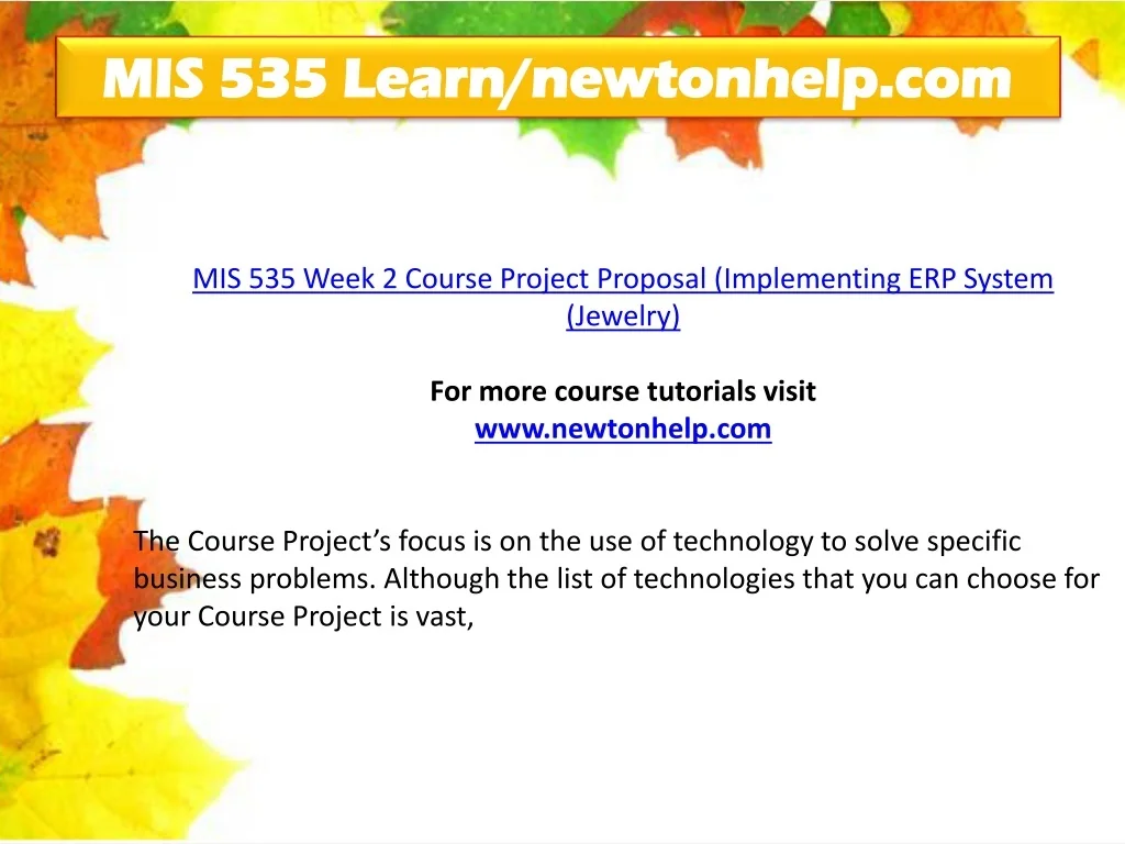 MIS 535 Learn/newtonhelp.com MIS 535 Week 2 Course Project Proposal Applications of Info Tech For more course tutorials visit www.newtonhelp.com The Course Project’s focus is on the use of technology to solve specific business problems. Although the list of technologies that you can choose for your Course Project is vast,