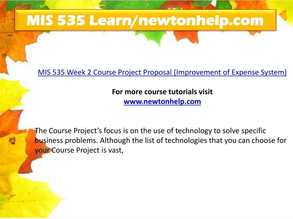 MIS 535 Learn/newtonhelp.com MIS 535 Week 2 Course Project Proposal (Improvement of Expense System) For more course tutorials visit www.newtonhelp.com The Course Project’s focus is on the use of technology to solve specific business problems. Although the list of technologies that you can choose for your Course Project is vast,