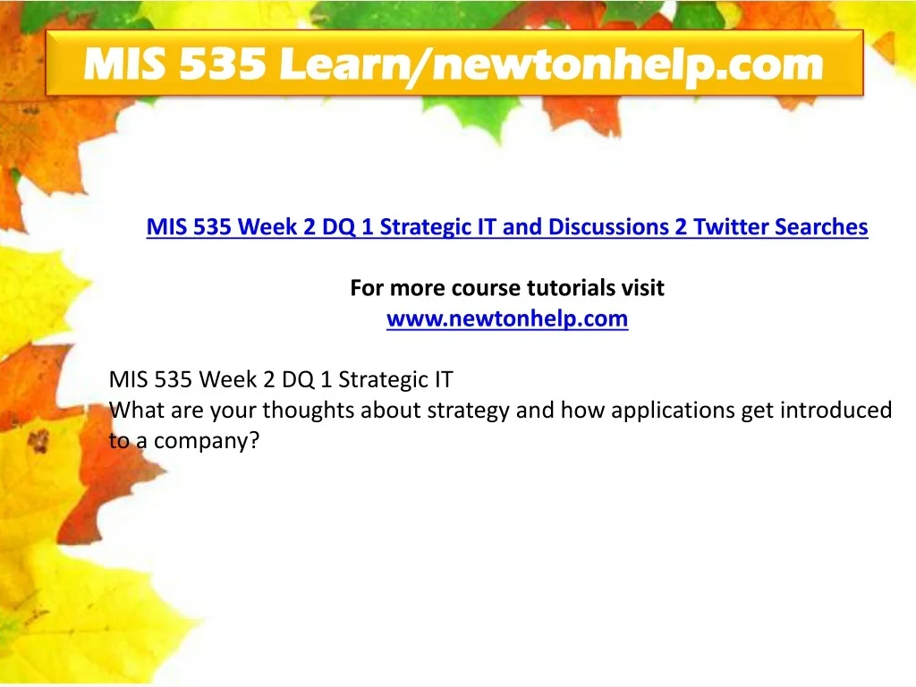 MIS 535 Learn/newtonhelp.com MIS 535 Week 2 DQ 1 Strategic IT and Discussions 2 Twitter Searches For more course tutorials visit www.newtonhelp.com MIS 535 Week 2 DQ 1 Strategic IT What are your thoughts about strategy and how applications get introduced to a company?