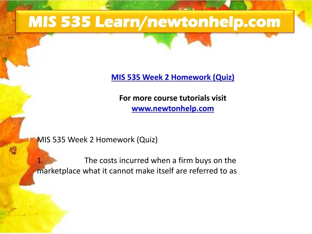 MIS 535 Learn/newtonhelp.com MIS 535 Week 2 Homework (Quiz) For more course tutorials visit www.newtonhelp.com MIS 535 Week 2 Homework (Quiz) 1. The costs incurred when a firm buys on the marketplace what it cannot make itself are referred to as
