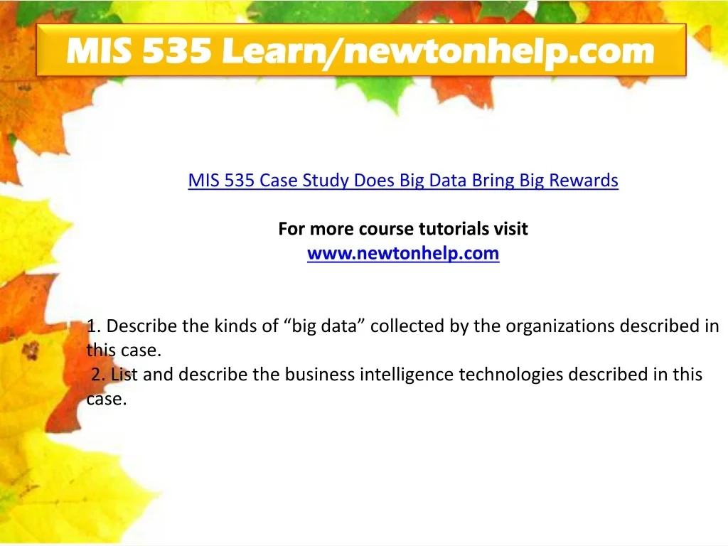 MIS 535 Learn/newtonhelp.com MIS 535 Case Study Does Big Data Bring Big Rewards For more course tutorials visit www.newtonhelp.com 1. Describe the kinds of “big data” collected by the organizations described in this case. 2. List and describe the business intelligence technologies described in this case.