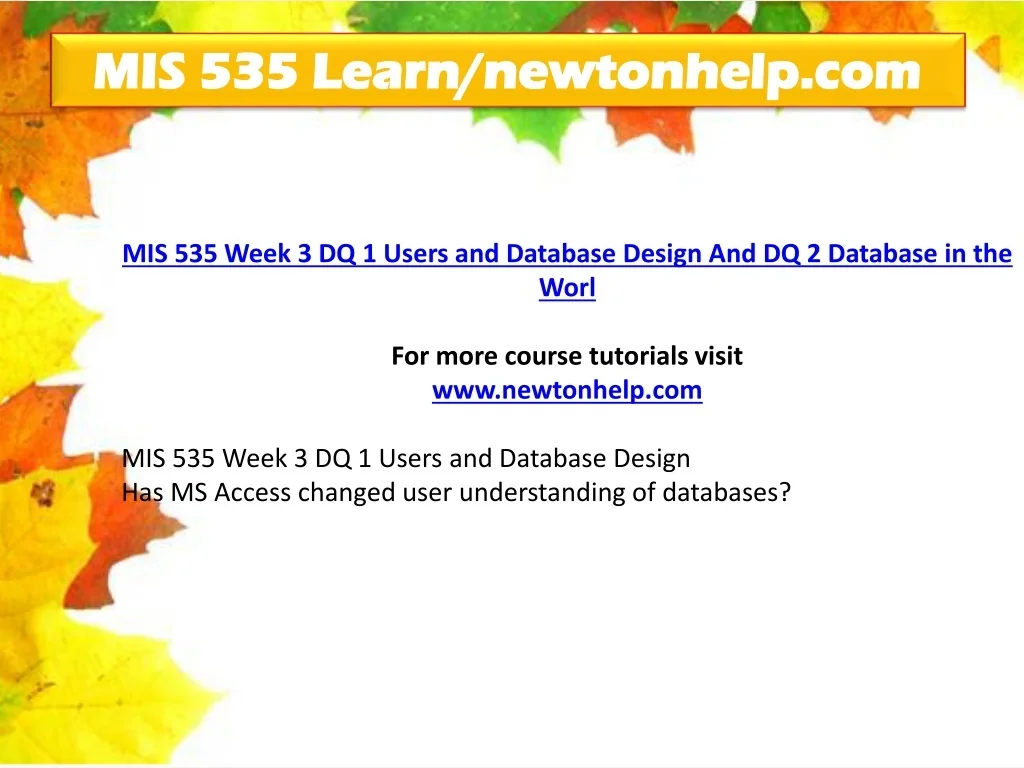 MIS 535 Learn/newtonhelp.com MIS 535 Week 3 DQ 1 Users and Database Design And DQ 2 Database in the Worl For more course tutorials visit www.newtonhelp.com MIS 535 Week 3 DQ 1 Users and Database Design Has MS Access changed user understanding of databases?