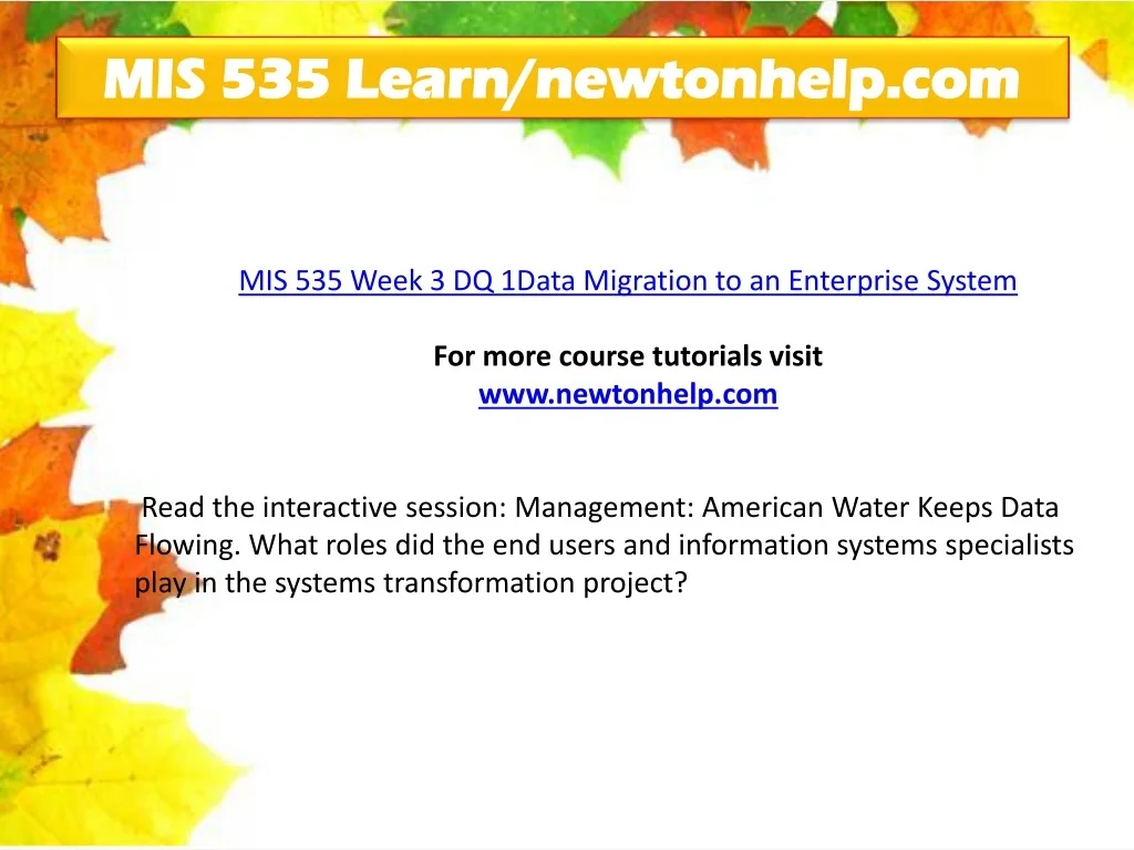 MIS 535 Learn/newtonhelp.com MIS 535 Week 3 DQ 1Data Migration to an Enterprise System For more course tutorials visit www.newtonhelp.com Read the interactive session: Management: American Water Keeps Data Flowing. What roles did the end users and information systems specialists play in the systems transformation project?