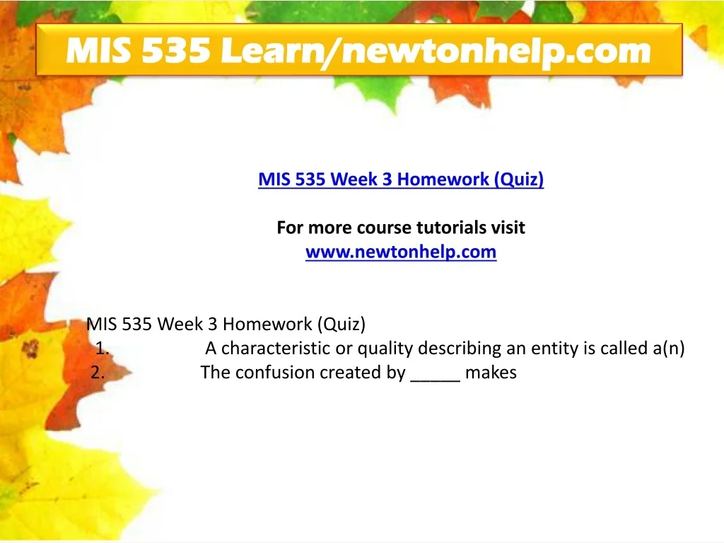 MIS 535 Learn/newtonhelp.com MIS 535 Week 3 Homework (Quiz) For more course tutorials visit www.newtonhelp.com MIS 535 Week 3 Homework (Quiz) 1. A characteristic or quality describing an entity is called a(n) 2. The confusion created by _____ makes