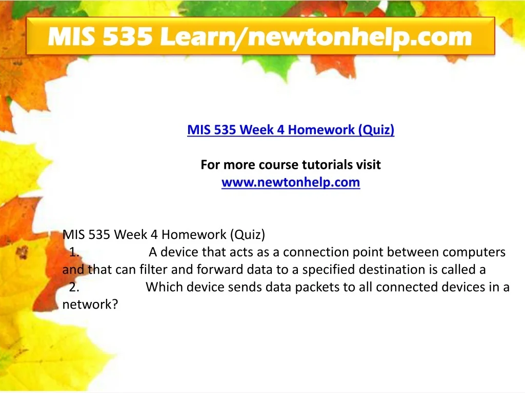 MIS 535 Learn/newtonhelp.com MIS 535 Week 4 Homework (Quiz) For more course tutorials visit www.newtonhelp.com MIS 535 Week 4 Homework (Quiz) 1. A device that acts as a connection point between computers and that can filter and forward data to a specified destination is called a 2. Which device sends data packets to all connected devices in a network?
