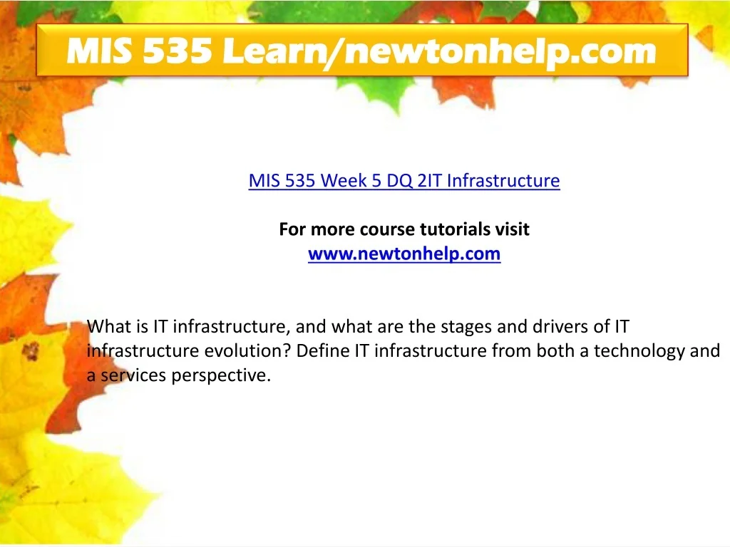 MIS 535 Learn/newtonhelp.com MIS 535 Week 5 DQ 2IT Infrastructure For more course tutorials visit www.newtonhelp.com What is IT infrastructure, and what are the stages and drivers of IT infrastructure evolution? Define IT infrastructure from both a technology and a services perspective.