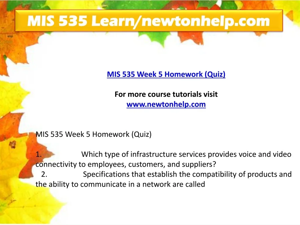 MIS 535 Learn/newtonhelp.com MIS 535 Week 5 Homework (Quiz) For more course tutorials visit www.newtonhelp.com MIS 535 Week 5 Homework (Quiz) 1. Which type of infrastructure services provides voice and video connectivity to employees, customers, and suppliers? 2. Specifications that establish the compatibility of products and the ability to communicate in a network are called