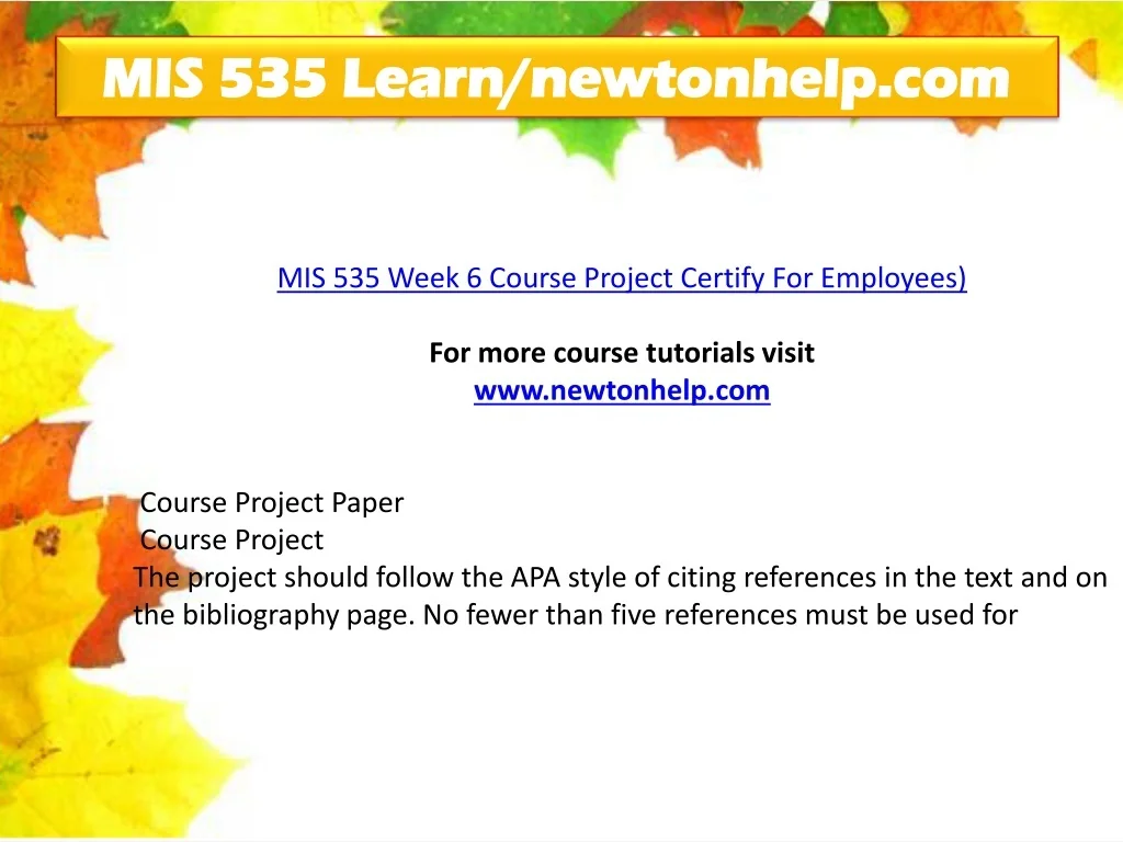 MIS 535 Learn/newtonhelp.com MIS 535 Week 6 Course Project Certify For Employees) For more course tutorials visit www.newtonhelp.com Course Project Paper Course Project The project should follow the APA style of citing references in the text and on the bibliography page. No fewer than five references must be used for