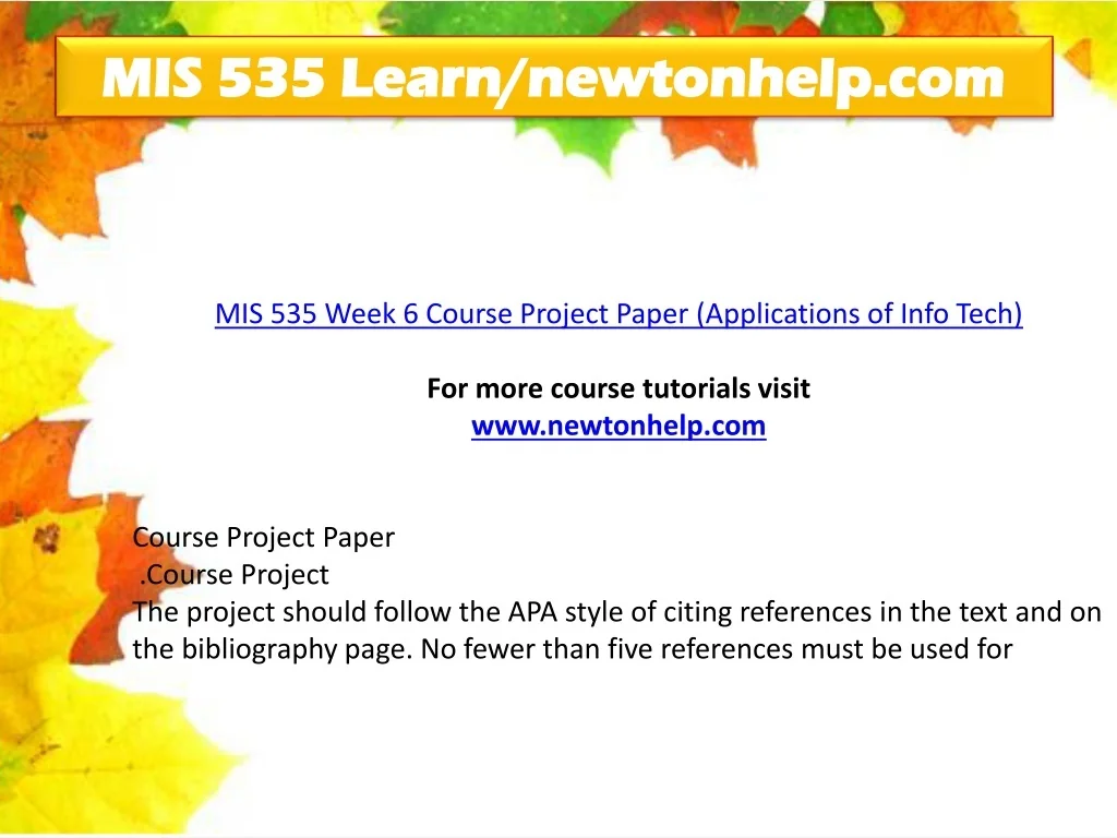 MIS 535 Learn/newtonhelp.com MIS 535 Week 6 Course Project Paper (Applications of Info Tech) For more course tutorials visit www.newtonhelp.com Course Project Paper .Course Project The project should follow the APA style of citing references in the text and on the bibliography page. No fewer than five references must be used for