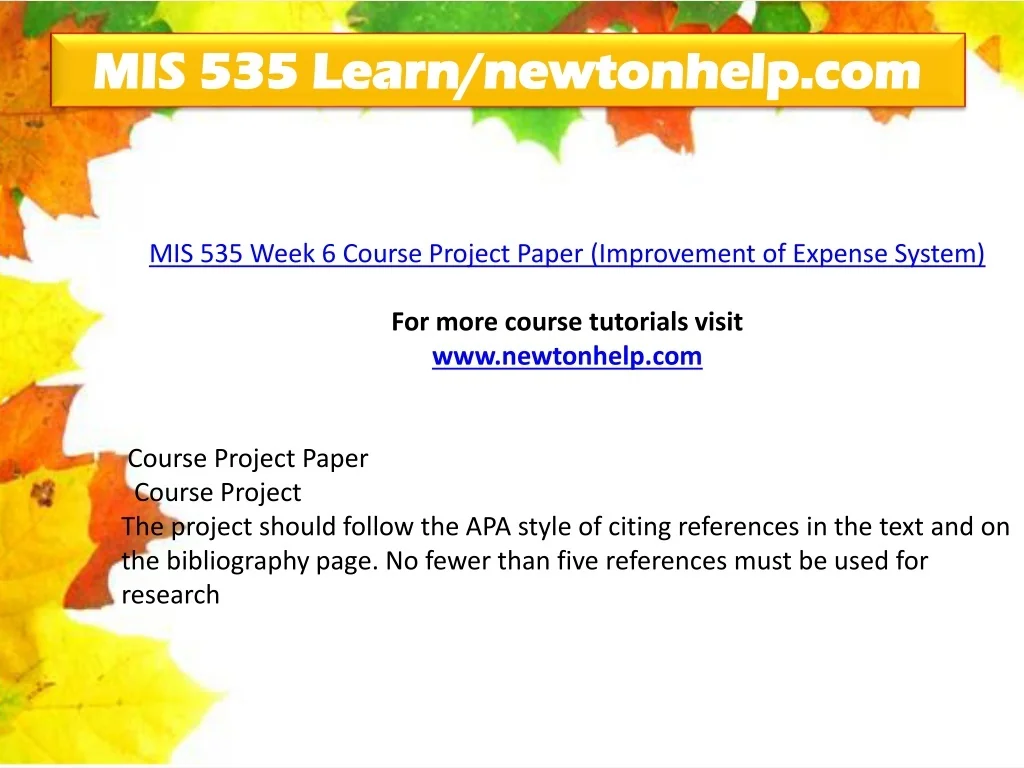MIS 535 Learn/newtonhelp.com MIS 535 Week 6 Course Project Paper (Improvement of Expense System) For more course tutorials visit www.newtonhelp.com Course Project Paper Course Project The project should follow the APA style of citing references in the text and on the bibliography page. No fewer than five references must be used for research