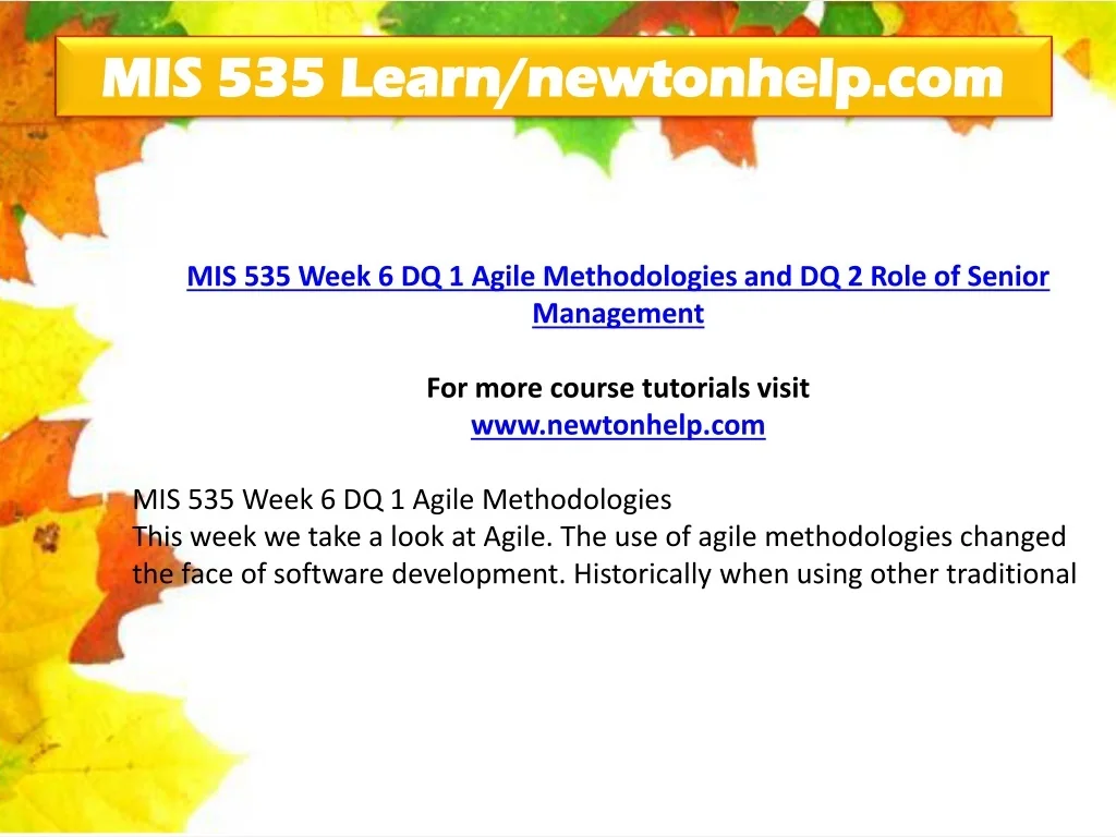 MIS 535 Learn/newtonhelp.com MIS 535 Week 6 DQ 1 Agile Methodologies and DQ 2 Role of Senior Management For more course tutorials visit www.newtonhelp.com MIS 535 Week 6 DQ 1 Agile Methodologies This week we take a look at Agile. The use of agile methodologies changed the face of software development. Historically when using other traditional