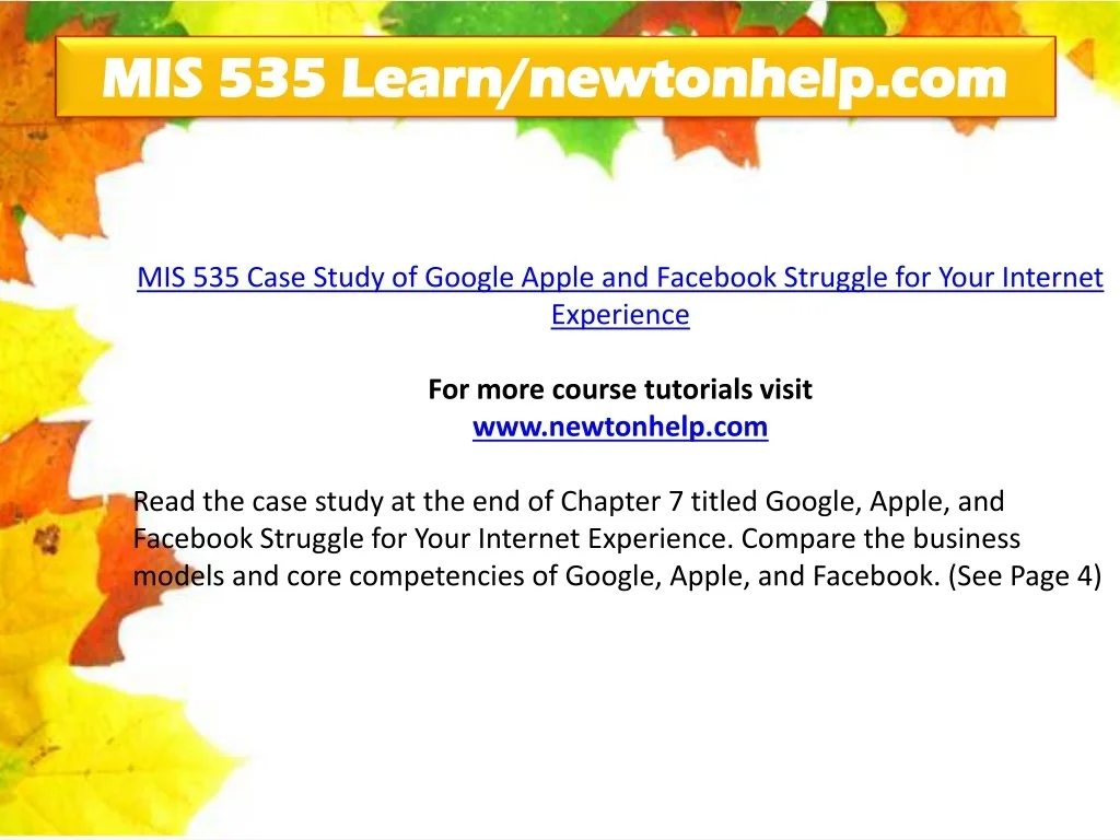 MIS 535 Learn/newtonhelp.com MIS 535 Case Study of Google Apple and Facebook Struggle for Your Internet Experience For more course tutorials visit www.newtonhelp.com Read the case study at the end of Chapter 7 titled Google, Apple, and Facebook Struggle for Your Internet Experience. Compare the business models and core competencies of Google, Apple, and Facebook. (See Page 4)