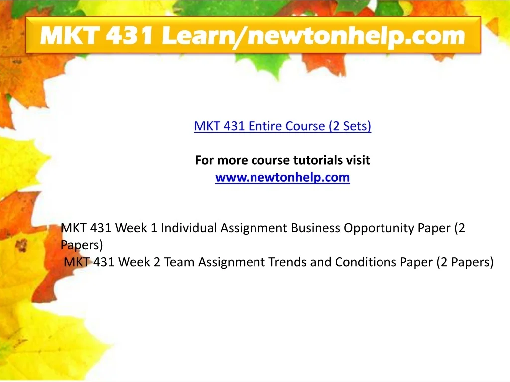 MKT 431 Learn/newtonhelp.com MKT 431 Entire Course (2 Sets) For more course tutorials visit www.newtonhelp.com MKT 431 Week 1 Individual Assignment Business Opportunity Paper (2 Papers) MKT 431 Week 2 Team Assignment Trends and Conditions Paper (2 Papers)