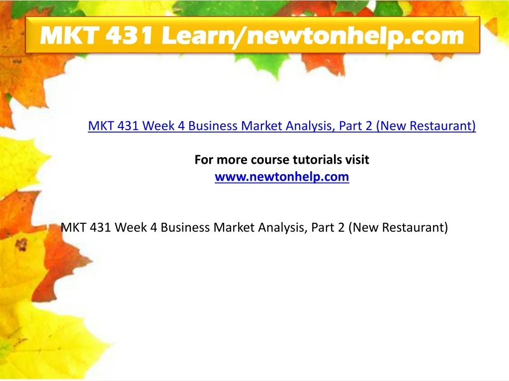 MKT 431 Learn/newtonhelp.com MKT 431 Week 1 Business Market Analysis, Part 1 (New Restaurant) For more course tutorials visit www.newtonhelp.com MKT 431 Week 1 Business Market Analysis, Part 1 (New Restaurant)