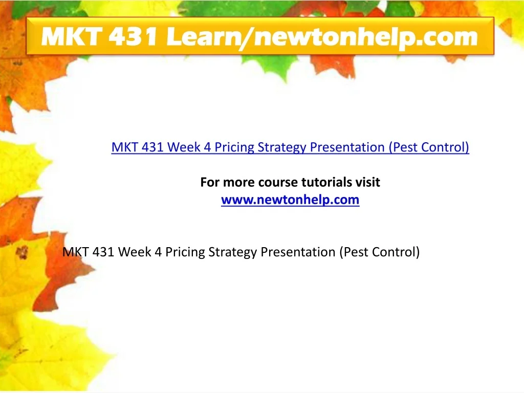 MKT 431 Learn/newtonhelp.com MKT 431 Week 4 Pricing Strategy Presentation (Pest Control) For more course tutorials visit www.newtonhelp.com MKT 431 Week 4 Pricing Strategy Presentation (Pest Control)