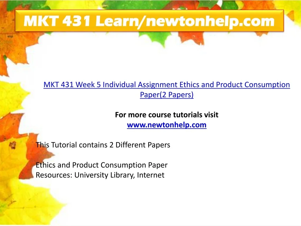 MKT 431 Learn/newtonhelp.com MKT 431 Week 5 Individual Assignment Ethics and Product Consumption Paper(2 Papers) For more course tutorials visit www.newtonhelp.com This Tutorial contains 2 Different Papers Ethics and Product Consumption Paper Resources: University Library, Internet