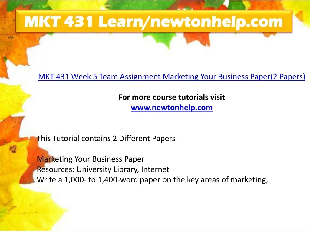 MKT 431 Learn/newtonhelp.com MKT 431 Week 5 Team Assignment Marketing Your Business Paper(2 Papers) For more course tutorials visit www.newtonhelp.com This Tutorial contains 2 Different Papers Marketing Your Business Paper Resources: University Library, Internet Write a 1,000- to 1,400-word paper on the key areas of marketing,