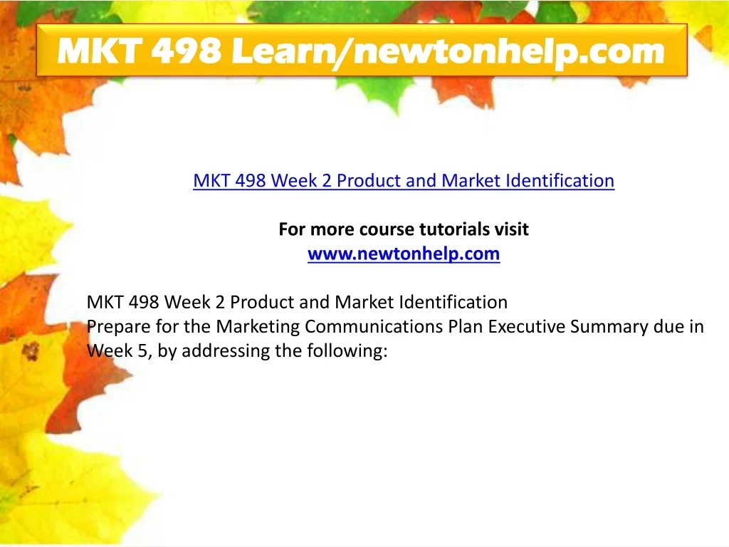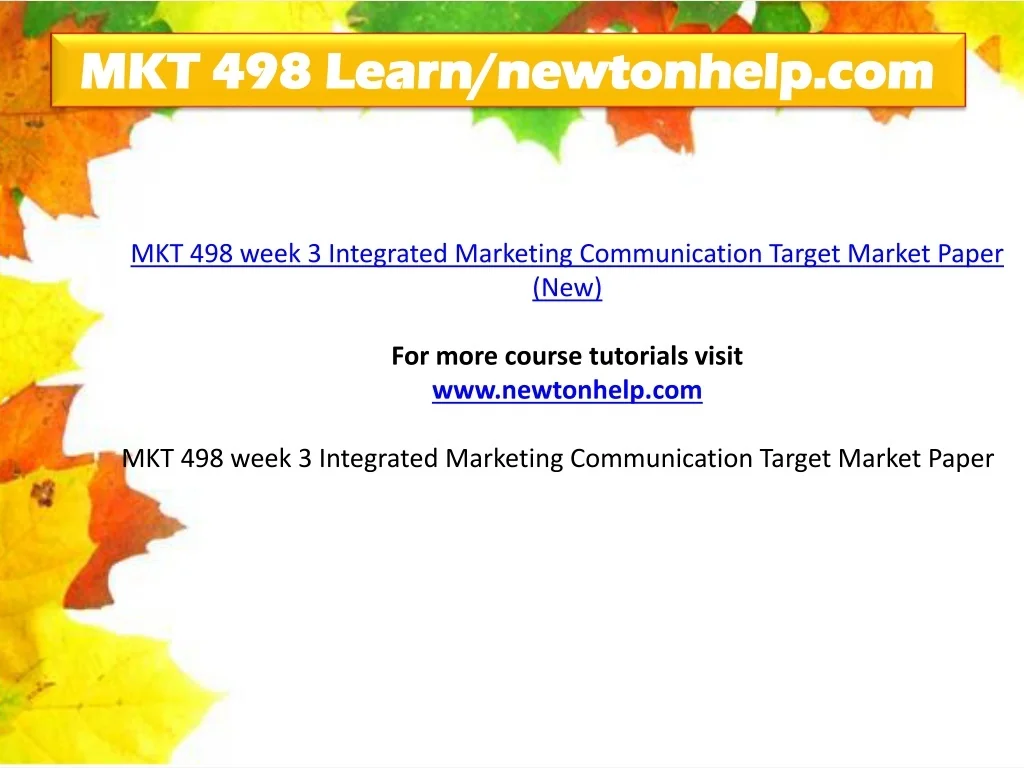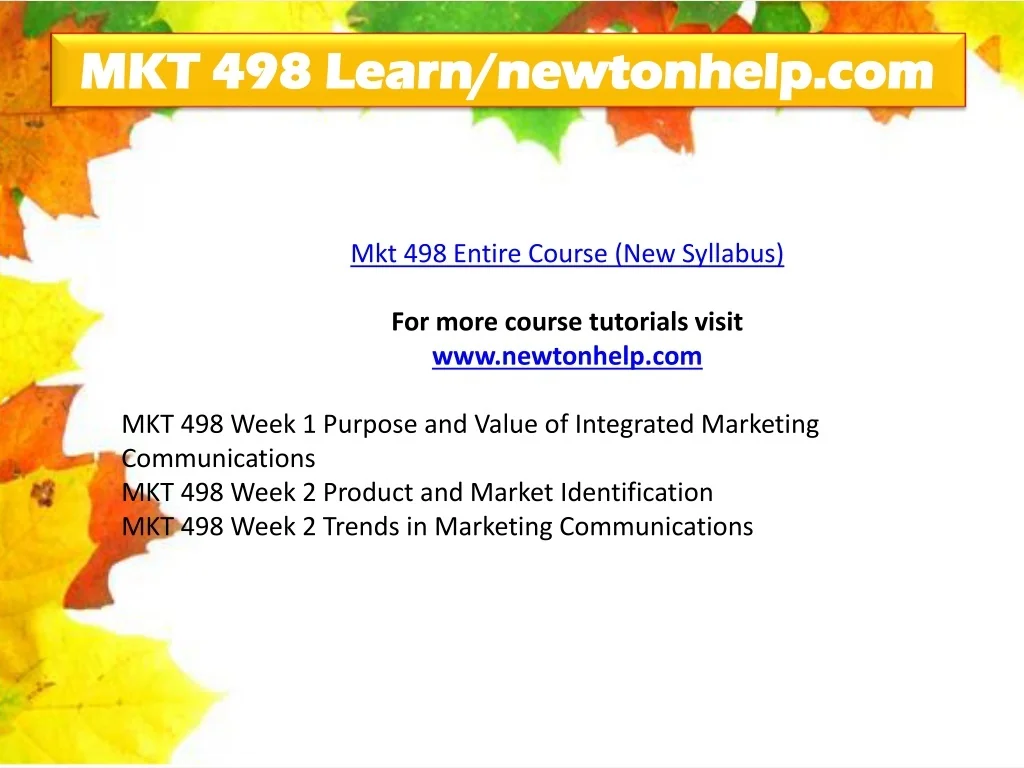 MKT 498 Learn/newtonhelp.com Mkt 498 Entire Course (New Syllabus) For more course tutorials visit www.newtonhelp.com MKT 498 Week 1 Purpose and Value of Integrated Marketing Communications MKT 498 Week 2 Product and Market Identification MKT 498 Week 2 Trends in Marketing Communications